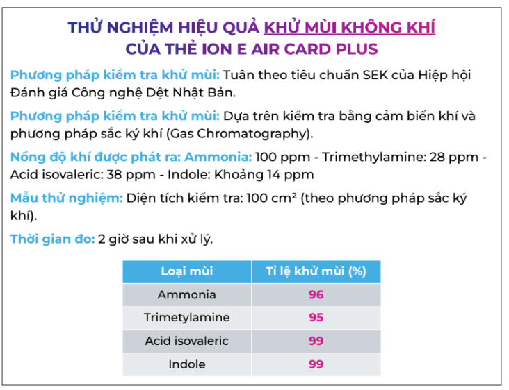 Bạn khó chịu vì mùi khói thuốc lá ám vào quần áo? Mùi thức ăn trong phòng kín? Hay mùi nội thất xe hơi? Nhờ quá trình oxy hóa của ion âm, chiếc thẻ này có khả năng trung hòa các phân tử mùi hôi cực tốt. Kiểm nghiệm cho thấy hiệu quả khử mùi thuốc lá đạt 87% và khử mùi nấm mốc/đồ cũ lên tới 94%.