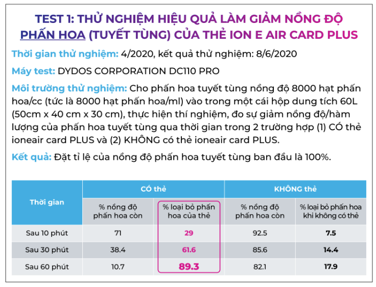 Bụi mịn PM2.5 là những hạt bụi siêu nhỏ có thể xâm nhập sâu vào phổi và máu. Theo các thử nghiệm, Ion e Air Card Plus giúp giảm thiểu nồng độ bụi mịn trong phạm vi 1m³ quanh người đeo. Đặc biệt, với những người bị viêm mũi dị ứng (hay hắt hơi khi gặp bụi hoặc phấn hoa), sản phẩm đã chứng minh khả năng loại bỏ tới 89.3% phấn hoa và các tác nhân gây dị ứng, giúp giảm đáng kể tần suất hắt hơi, sổ mũi.